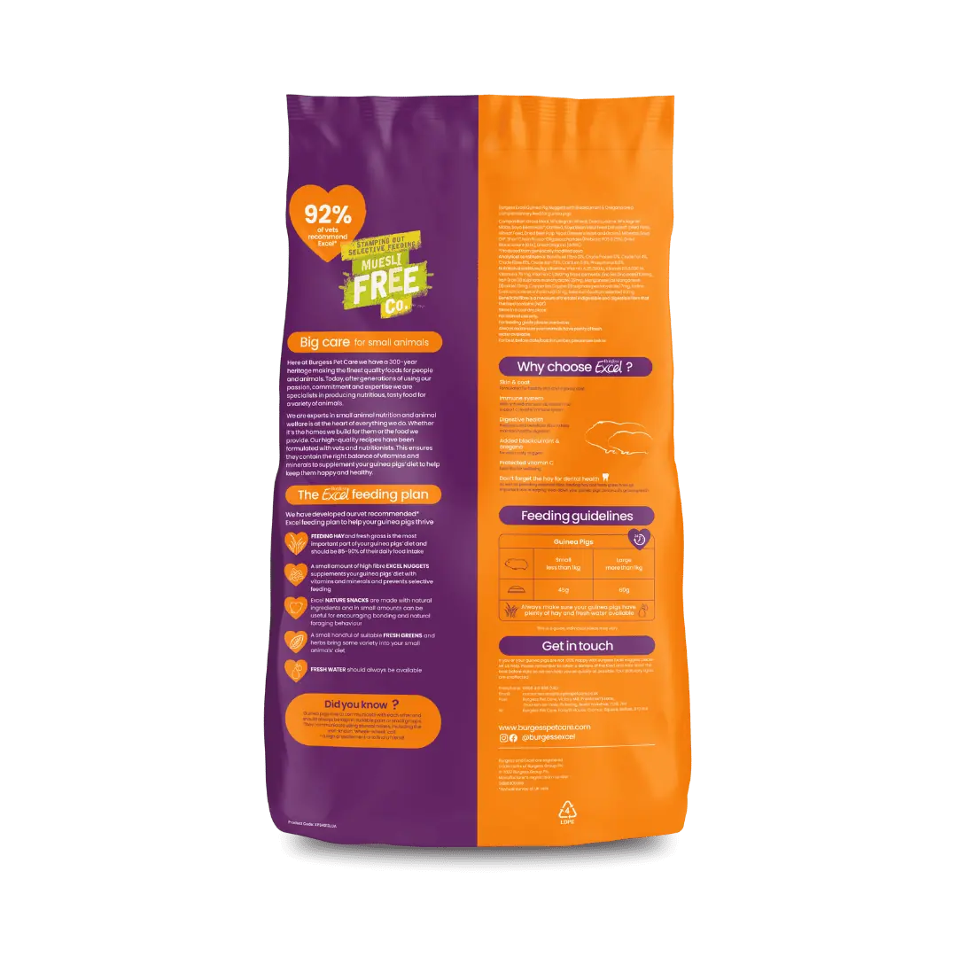 Remember that good quality hay and/or grass should make up the majority of your guinea pigs’ diet and should be available at all times. Guinea pigs should also be fed a small portion of Excel nuggets, the occasional Excel Nature Snack to add variety and encourage emotional enrichment, and a small handful of leafy greens each day. Fresh, clean water should always be available. Please talk to your vet for further information.