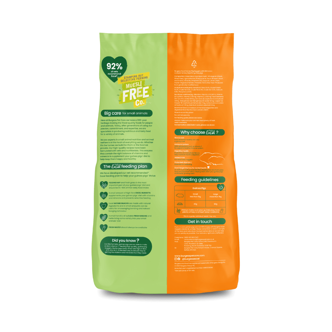 Remember that good quality hay and/or grass should make up the majority of your guinea pigs’ diet and should be available at all times. Guinea pigs should also be fed a small portion of Excel nuggets, the occasional Excel Nature Snack to add variety and encourage emotional enrichment, and a small handful of leafy greens each day. Fresh, clean water should always be available. Please talk to your vet for further information.
