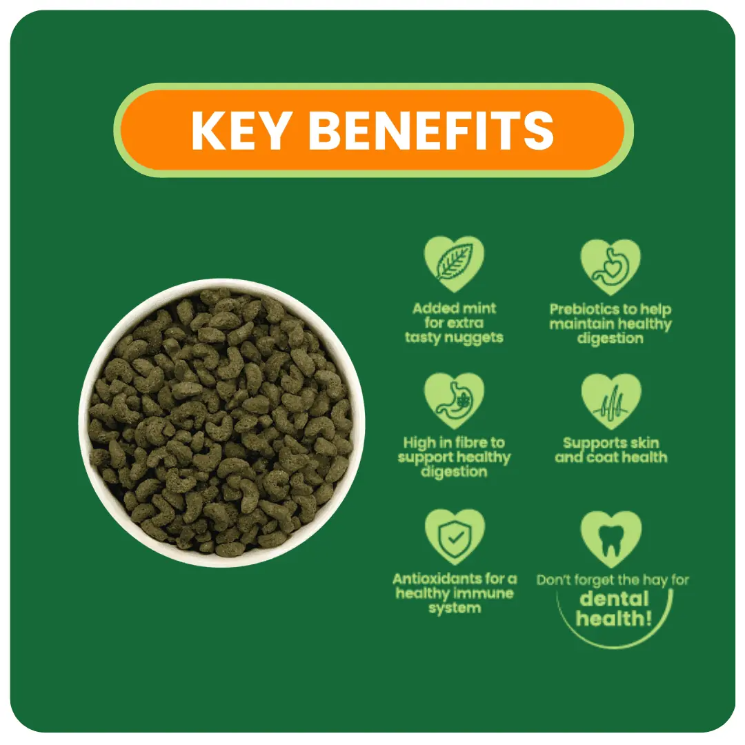 Composition: Grass Meal, Soya Bean Hulls*, Wholegrain Wheat, Wheat feed, Lignocellulose, Dried Lucerne, Yeast (Brewer’s Yeast and Grains), Minerals, Dried Mint (1%), Soya Oil*, Short Chain Fructo-Oligosaccharides (Prebiotic FOS 0.25%), Peas
