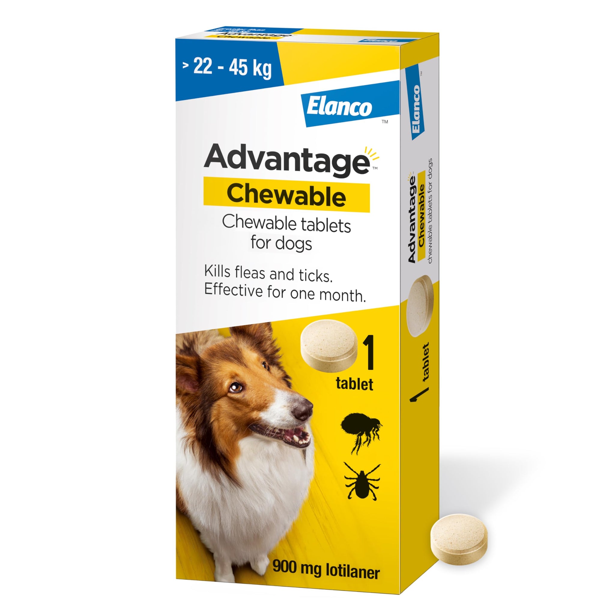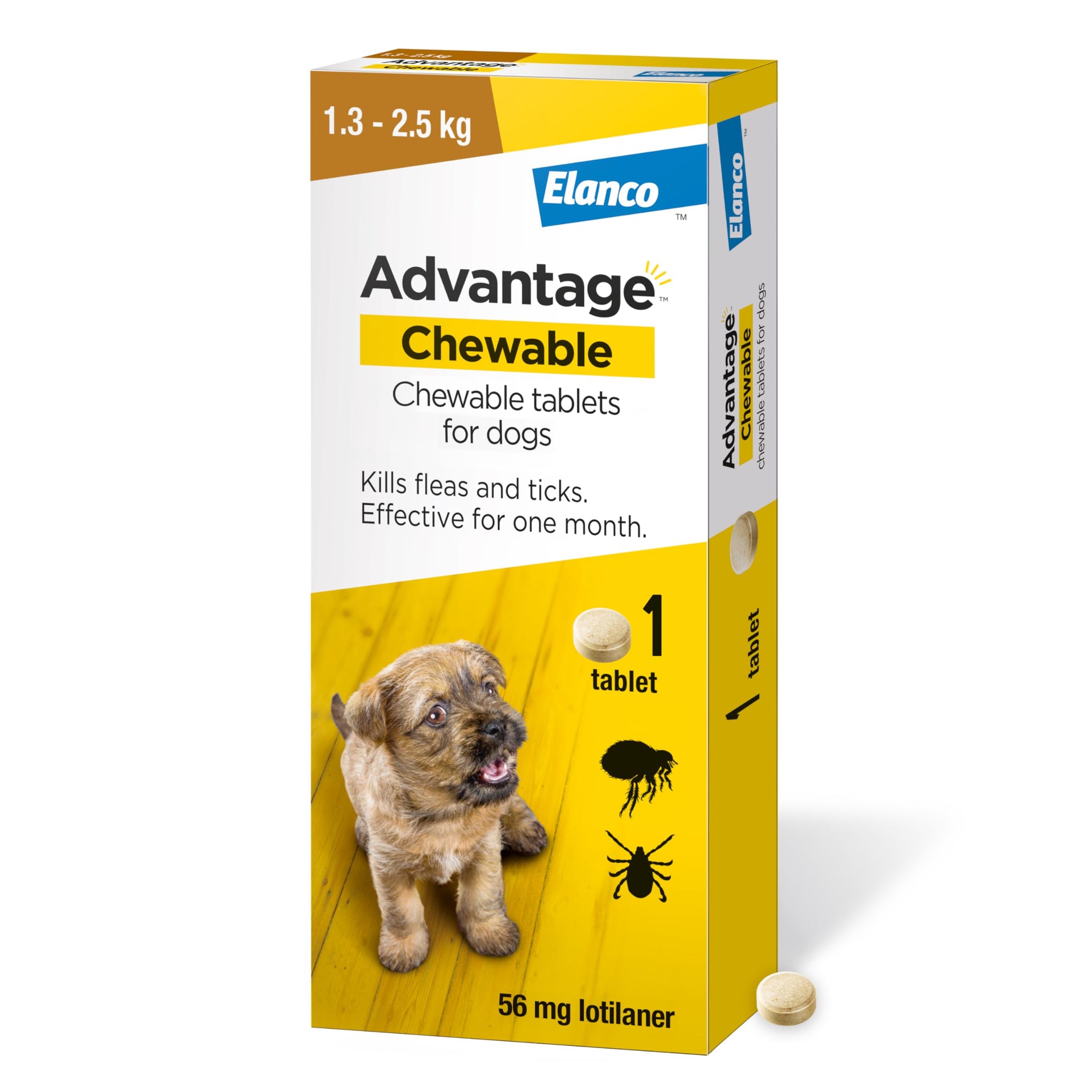 Advantage Chewable is a small, chewy, meat-flavoured tablet that treats dogs for ticks and fleas fast. It’s safe, effective, and starts working in just four hours. Advantage Chewable keeps working all month long, and because over 99% of dogs in our tests enjoyed it, you know that your pet is always getting the protection they need.