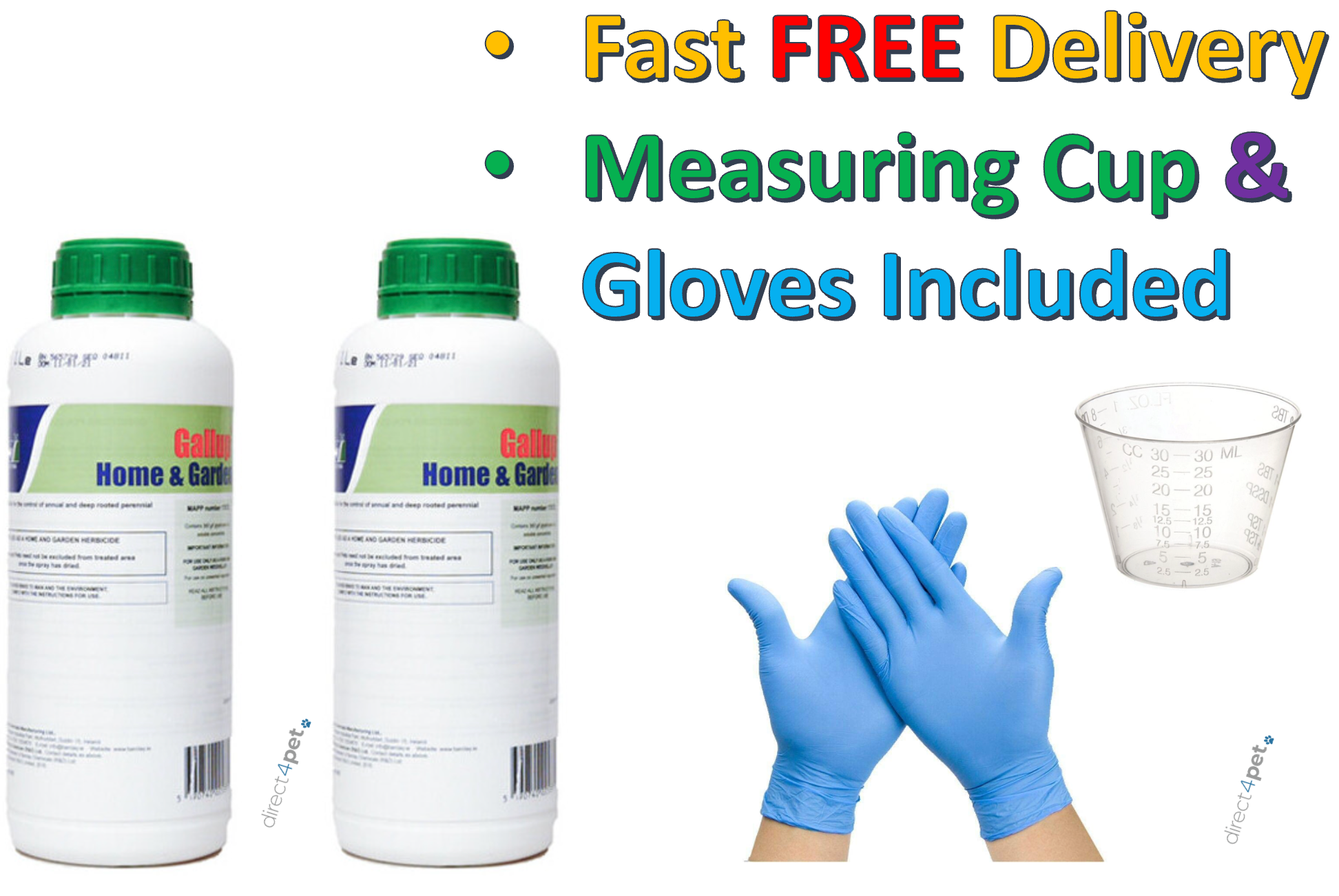 (Bundle contains 2 x Gallup Glyphosate Home & Garden 1L, 1 x 30ml measuring cup and a pair of disposable gloves)