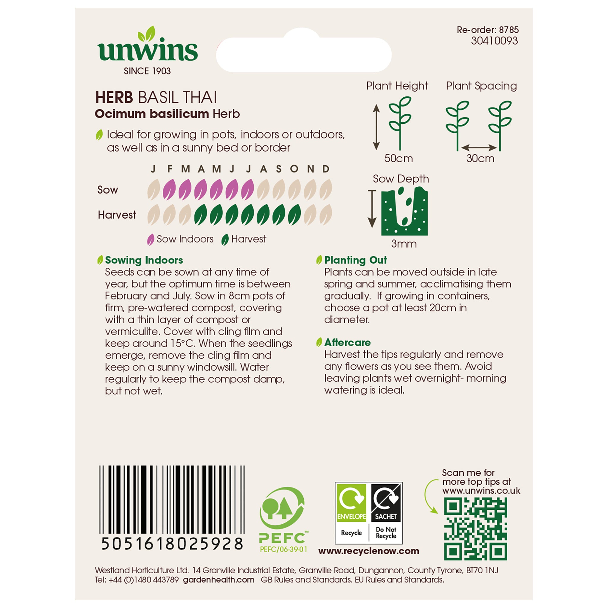 Unwins Basil Thai Seeds produce unique, liqourice-flavoured leaves that are perfect for growing in pots, indoor or outdoor.