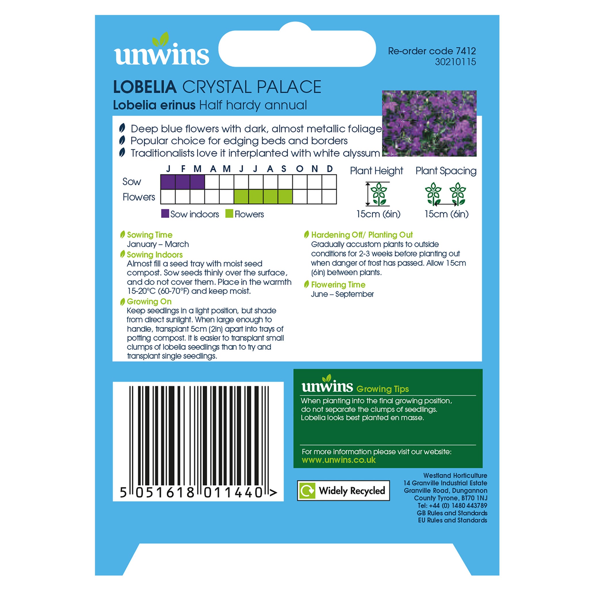 Unwins Bush Lobelia Crystal Palace Seeds produce attractive, deep blue flowers with a bronze-tinged foliage. This hardy annual flower has a long flowering season and looks appealing in pots and borders.