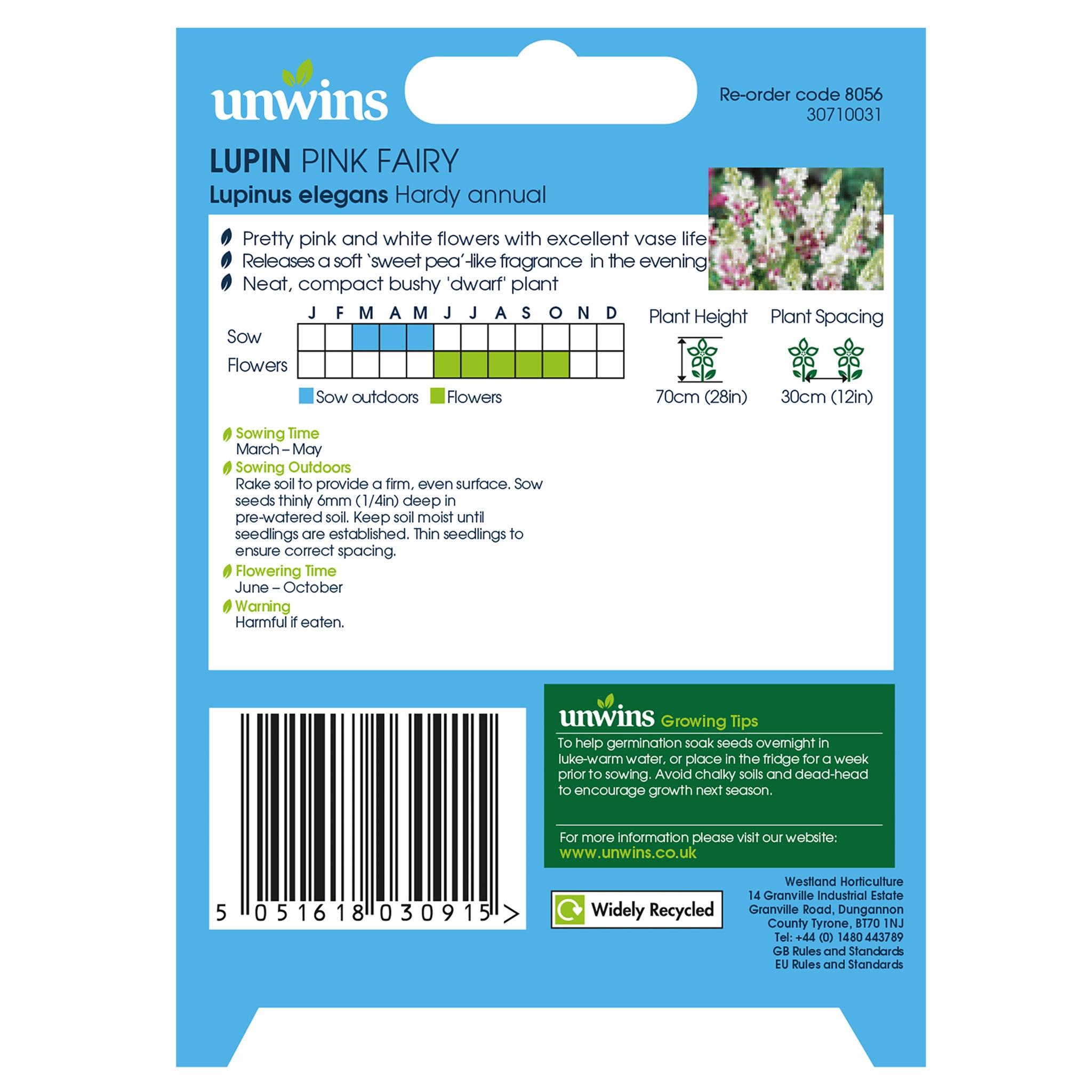 Unwins Lupin Pink Fairy Seeds produce a beautiful hardy annual with impressive fragrant flowers. These seeds are easy to grow and will return year after year.