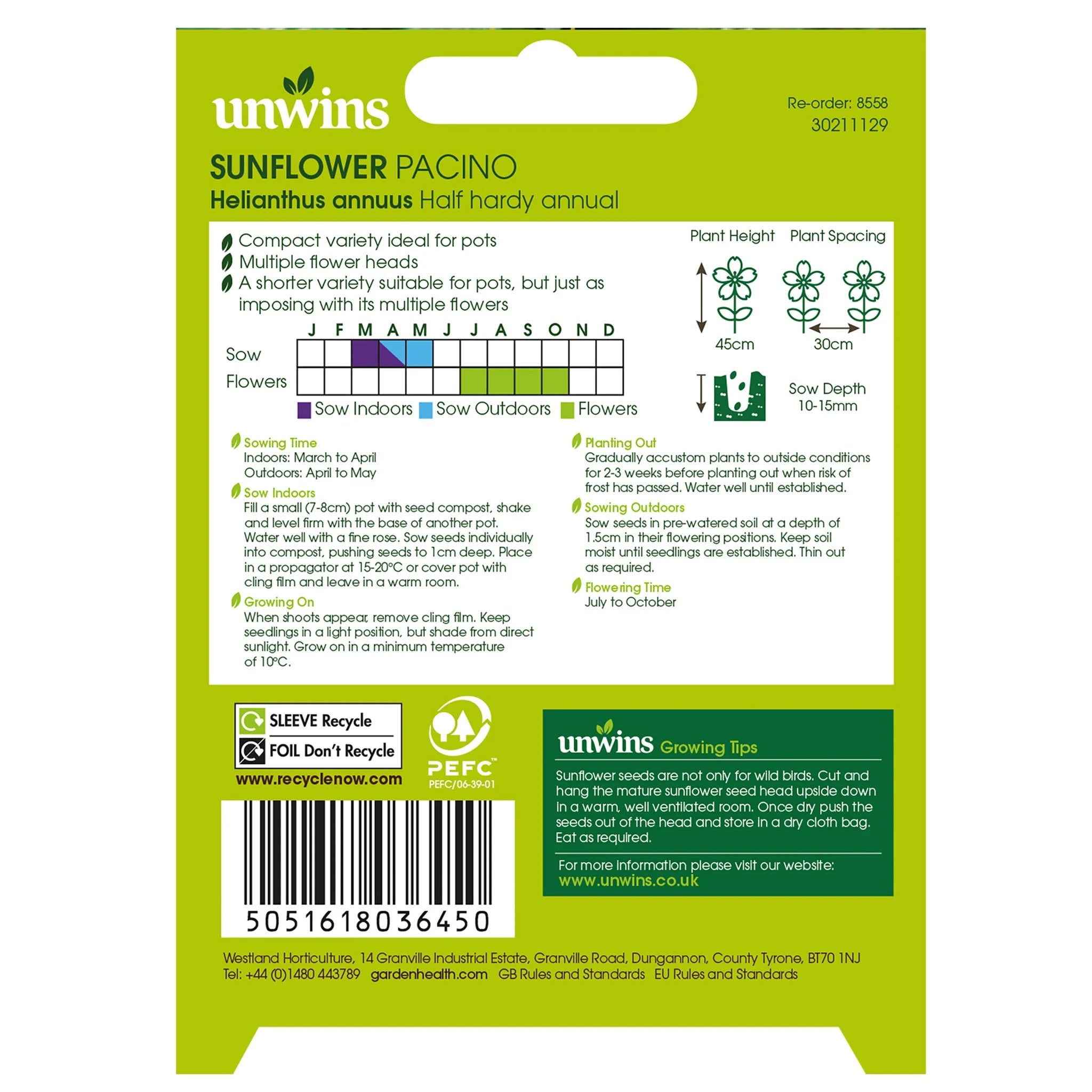 Nature's Haven Sunflower Pacino is a compact variety of sunflower that's ideal for pots. Although short, Pacino has multiple flower heads, and so it's just as imposing as other varieties.