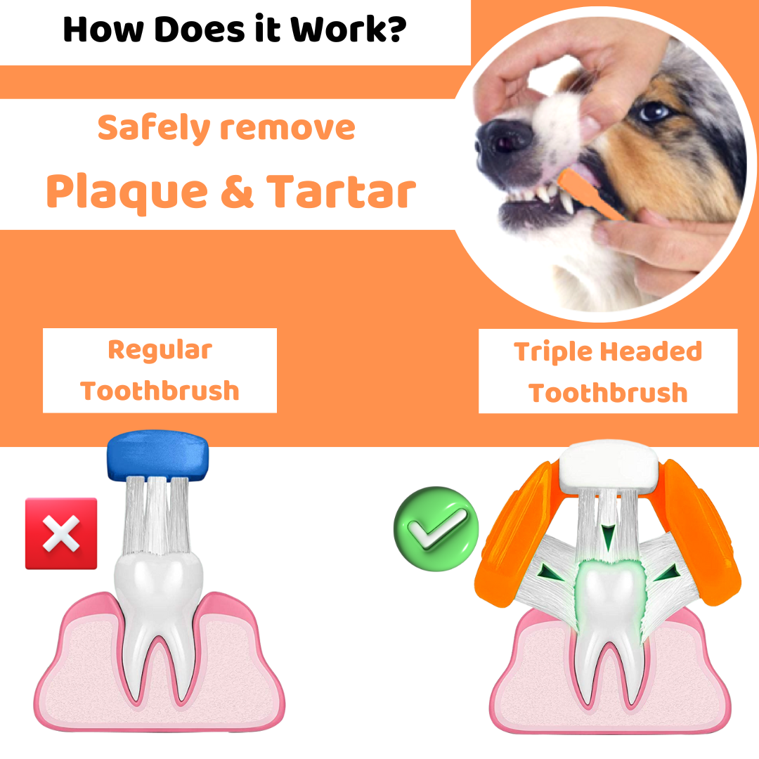 2. Next, place a small amount of toothpaste on the triple-headed toothbrush and gently massage your dog’s teeth back and forth slowly, ensuring each tooth is encased around the three sides of the brush