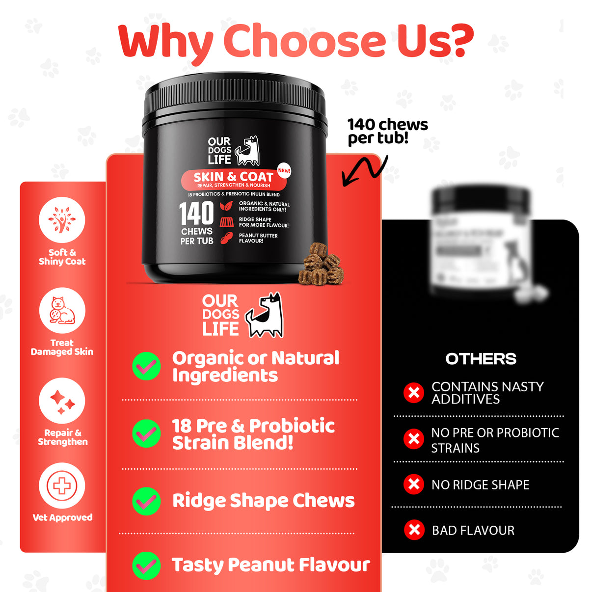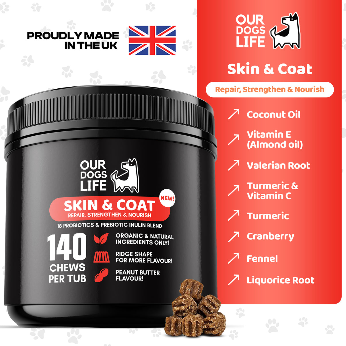 OurDogsLife have worked with vets to formulate the perfect balance of ingredients to encourage healthy skin and coat in dogs. These include: • Coconut oil is rich in fatty acids, coconut oil moisturises the skin, promotes a healthy coat, and possesses antibacterial properties. • Turmeric is known for anti-inflammatory effects, turmeric supports skin health, soothes irritations, and contributes to a glossy coat. • Liquorice root has anti-inflammatory and antioxidant properties, aiding in alleviating skin conditions and promoting coat health. • Valerian root may help relieve stress-related skin issues, promoting a calm environment for healthier skin and coat. • Cranberry offers antioxidant support, contributing to overall skin health and helping prevent oxidative damage. • Vitamin E (Almond Oil) nourishes the skin, supports cell regeneration, and contributes to a softer, more supple coat. • Vitamin C is essential for collagen production, aiding in skin elasticity and supporting a healthy, vibrant coat. • Fennel is rich in antioxidants and may help address skin inflammation, contributing to a healthier and more comfortable coat for dogs.