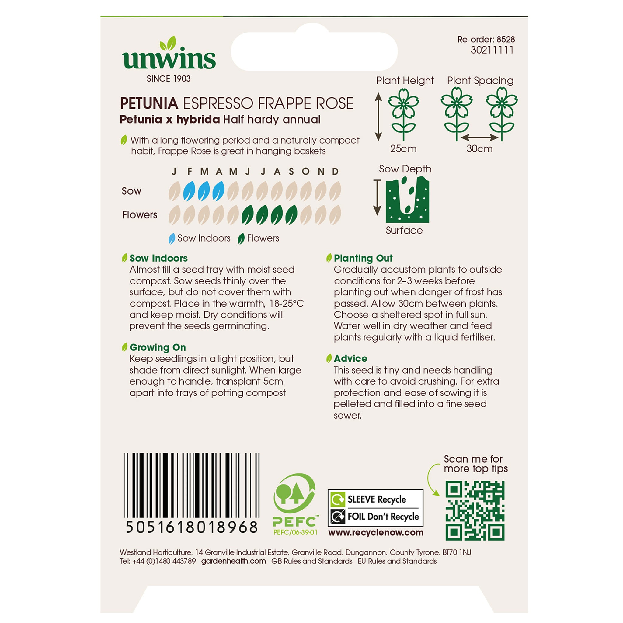 Unwins Petunia Espresso Frappe Rose is a stunning, frilled, rose-pink flower.