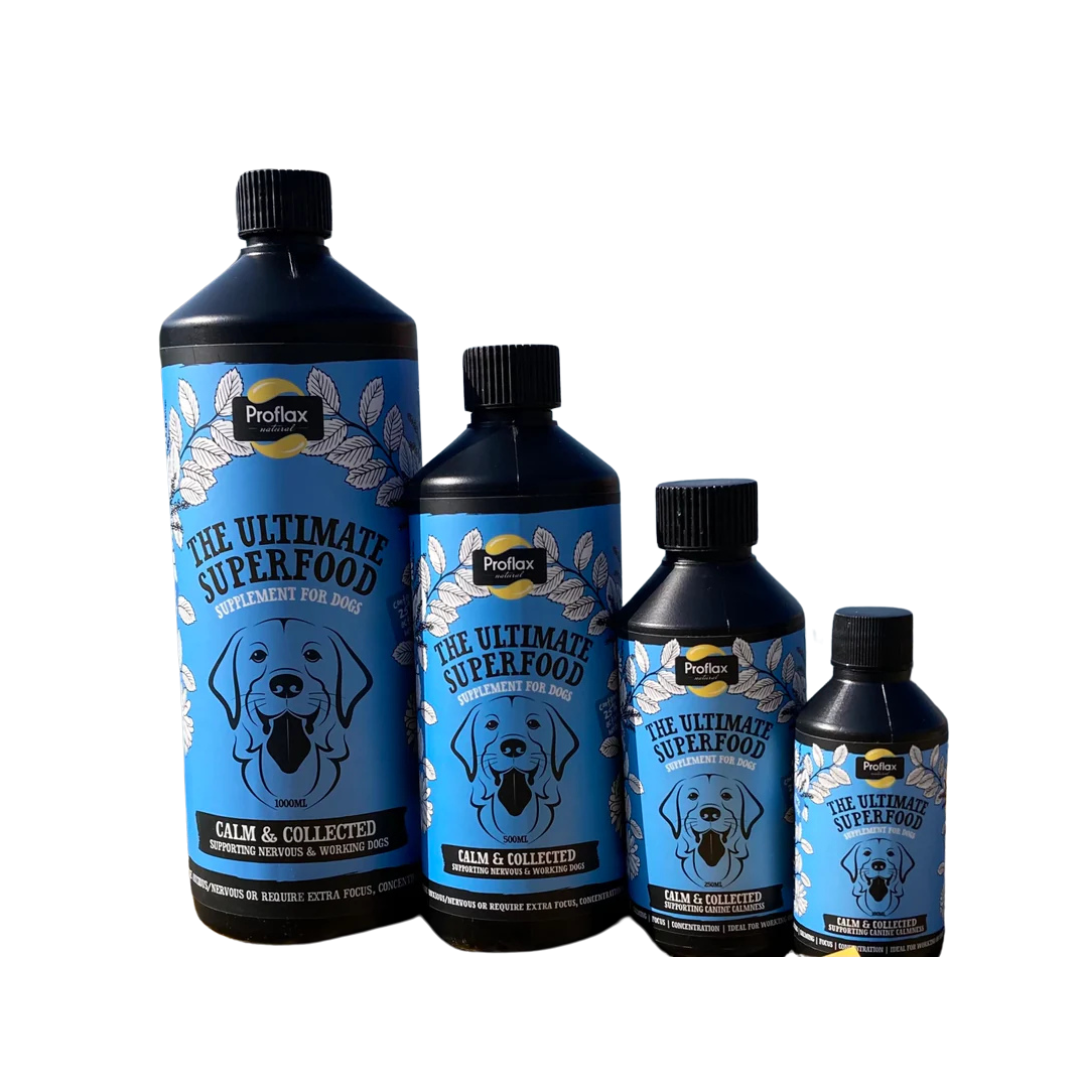 Proflax Calm & Collected is a 100% natural, ready-blended flaxseed oil & herbal tincture supplement. It is ideal for dogs with low level anxiety or those who struggle to keep their focus or concentration when training or competing. This holistic blend also supports overall general health & wellbeing.