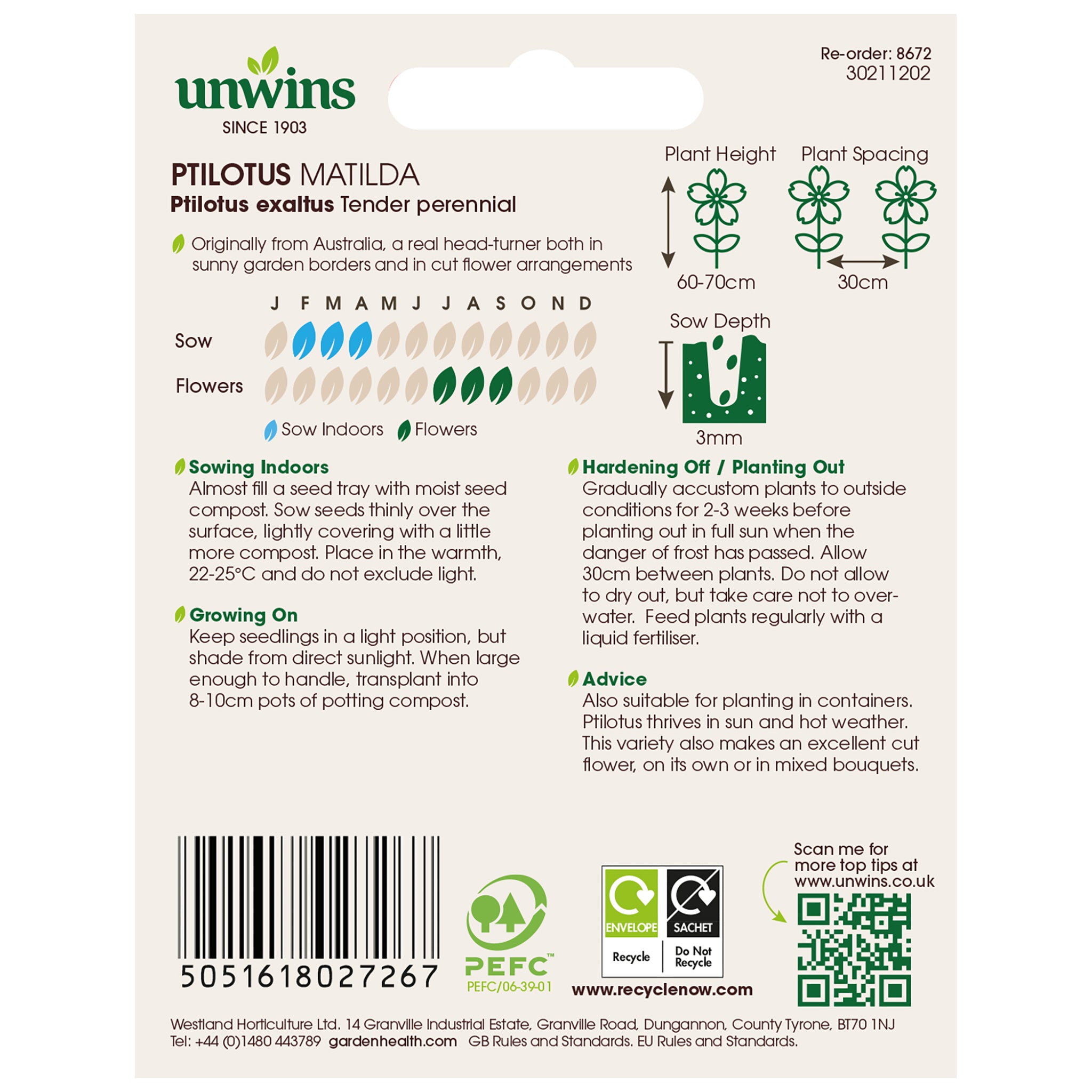 Unwins Ptilotus Matilda Seeds produce feathery plumes of purple-pink flowers. Sow indoors from February - April.