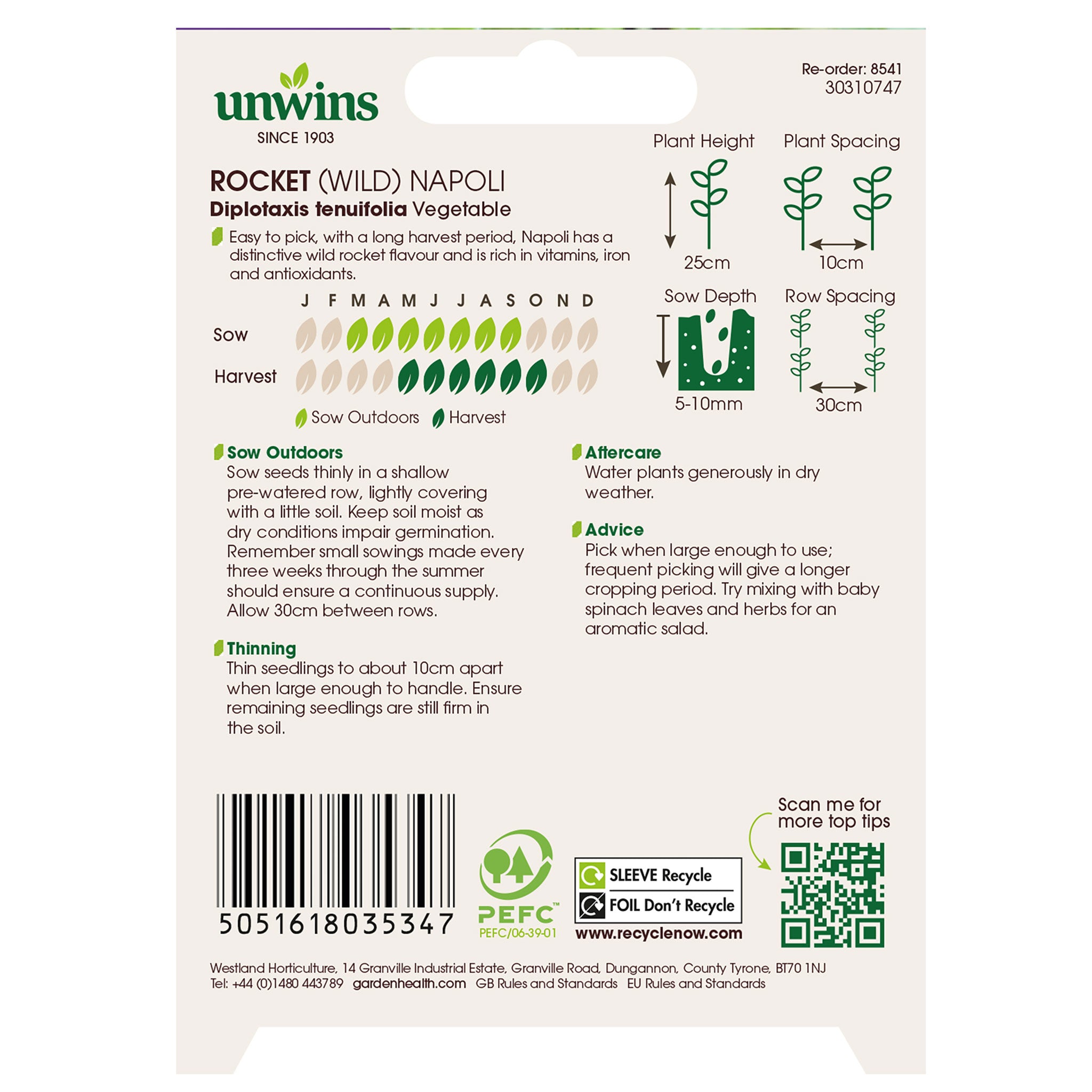 Water plants generously during dry weather. Pick leaves when large enough to use; frequent picking encourages a longer cropping period. Napoli rocket has a distinctive wild rocket flavour, is rich in vitamins, iron, and antioxidants, and is easy to pick. Try mixing with baby spinach and herbs for an aromatic salad.