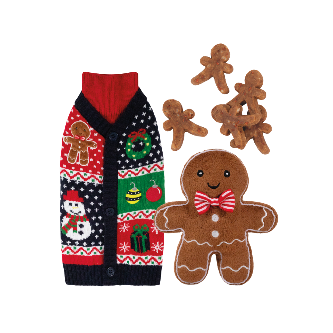 Included in this Christmas eve gift pack is a festive knit novelty dog jumper, a plush gingerbread squeaky dog toy and a 40g pack of real meat chicken (gingerbread shape) dog treats.