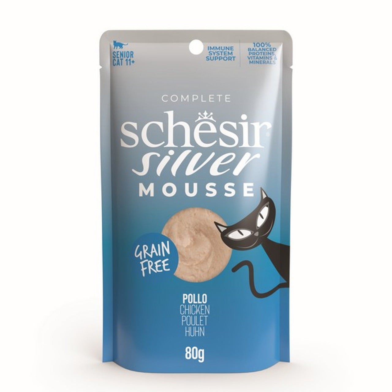 Schesir Silver Mousse for Senior Cats 80g is a 100% complete and balanced recipe, with all the proteins, vitamins and minerals necessary for cats from 11 years of age. Formulated to support the immune system, rich in protein from real chicken in soft mousse to facilitate chewing and tease the palate, rich in broth, to provide the necessary hydration to the cat, grain free, minimally processed quality ingredients with high nutritional value.