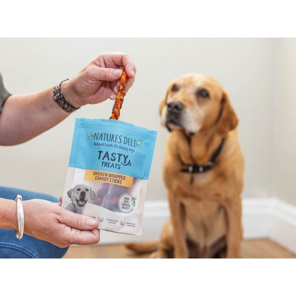 Natures Deli Carrot Wrapped Chicken 100g. A Big Hello from Petello! We make natural treats for happy dogs. They're healthily balanced, naturally nutritious and delicious, which is why we called them Natures Deli.Recommended For Dogs over 2 months.
