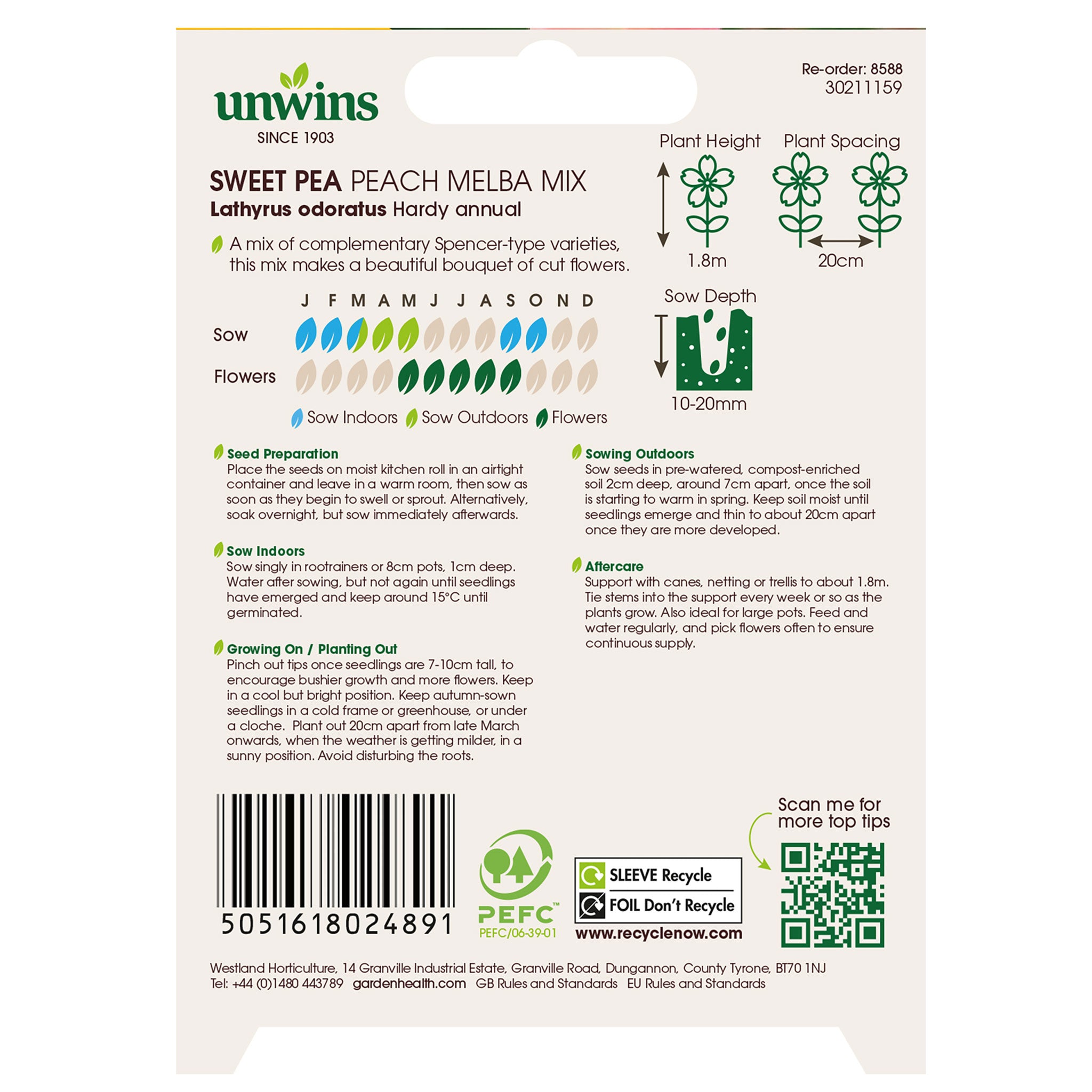 Unwins Sweet Pea Peach Melba Mix Seeds are the perfect combination of peach, apricot, and cream Spencer flowers.