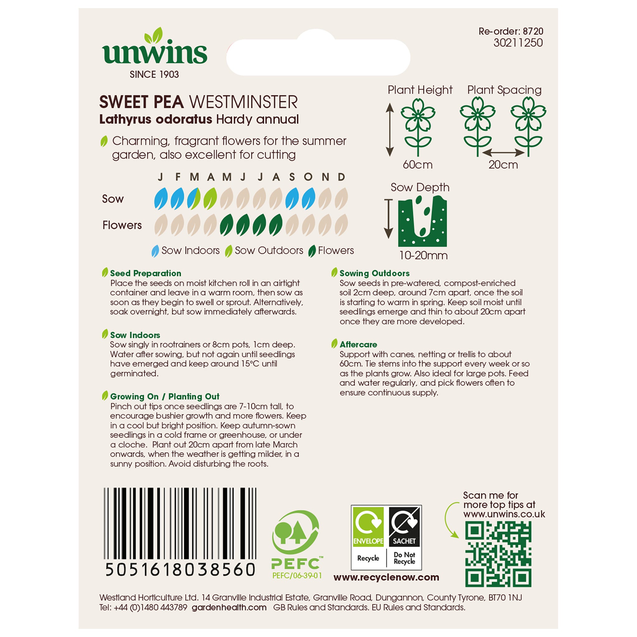Unwins Sweet Pea Westminster Seeds produce striking crimson flowers of the semi-dwarf type. Can be sown indoors or outdoors.